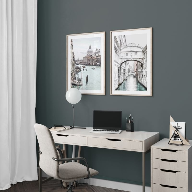 Pasisemkite įkvėpimo paveikslo sienai savo namų biure. Šiame puslapyje surinkome nuotraukų koliažus, skirtus namų biurui. Rūšiuokite pagal sienų spalvą arba plakatų skaičių ir pirkite visą paveikslo sieną arba išsirinkite jums labiausiai patinkančius plakatus ir rėmelius.