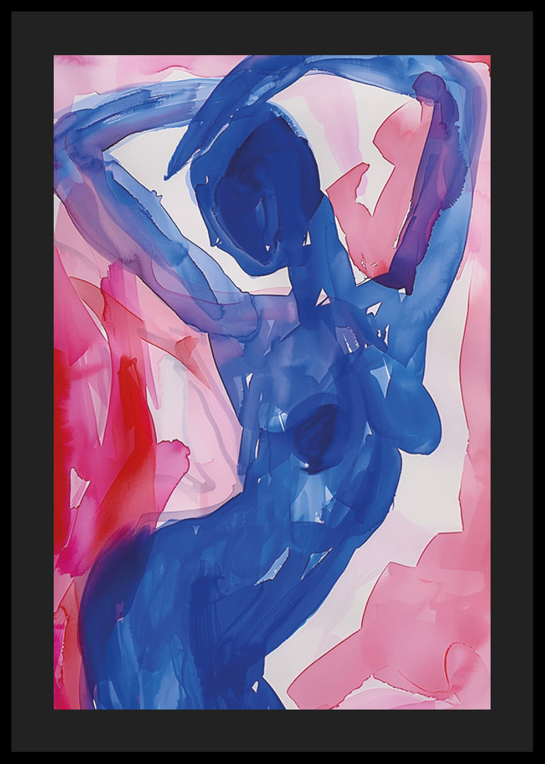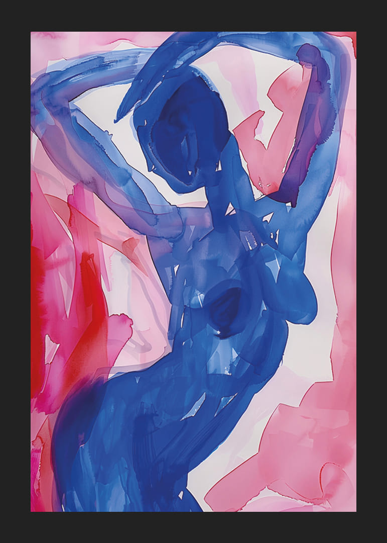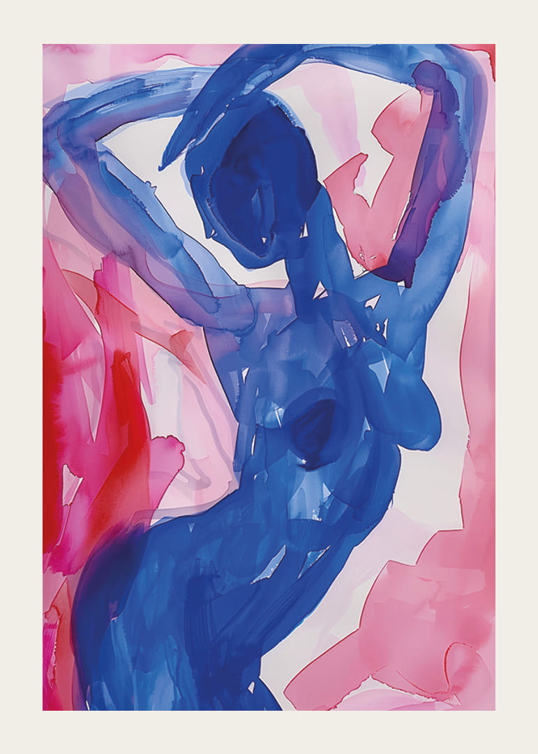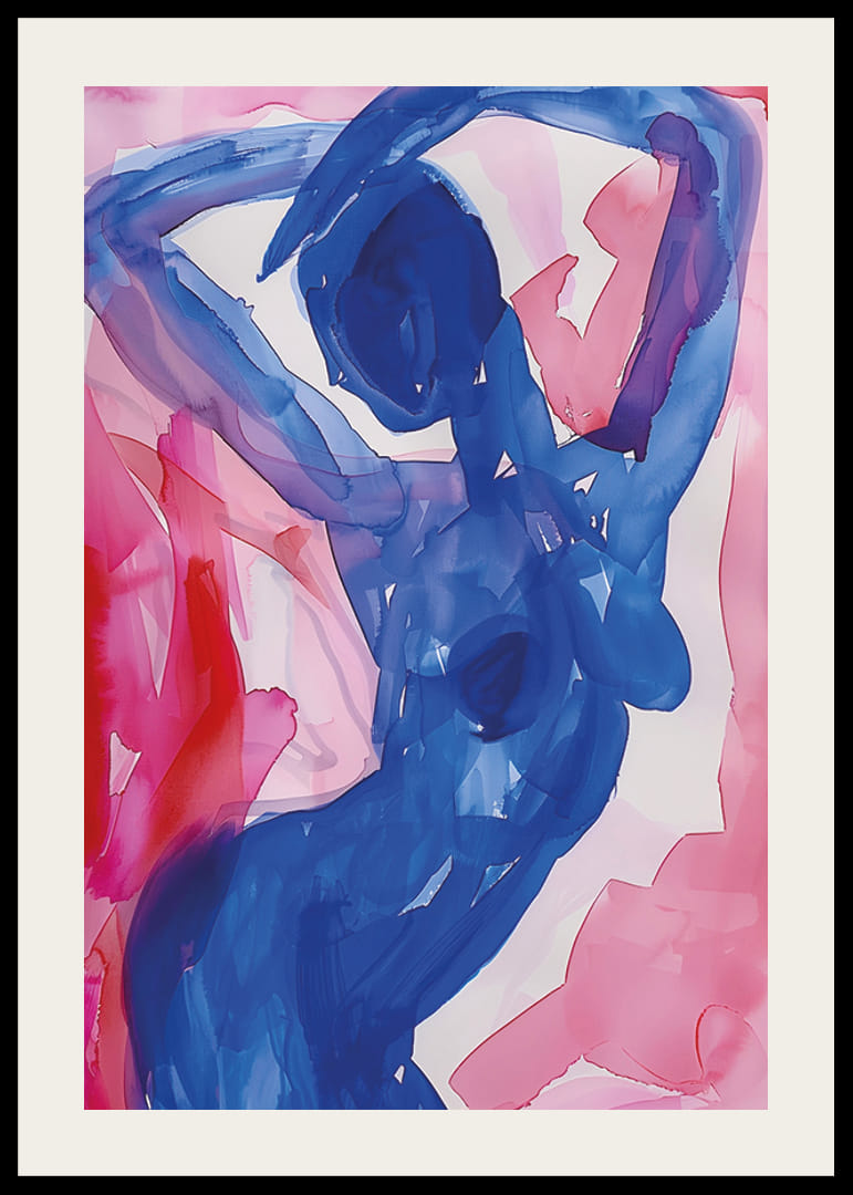 Šis plakatas patraukia akį mėlynu siluetu, kuris elegantiškai juda švelniomis, plačiomis linijomis. Fone harmoningai susilieja rausvos spalvos tonai, sukuriantys švelnų kontrastą su giliai mėlynais atspalviais. Tekančios kompozicijos formos žadina judėjimo ir laisvės pojūtį.