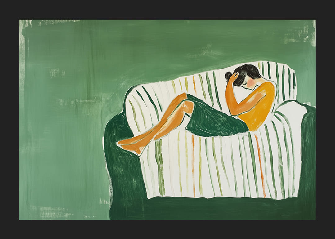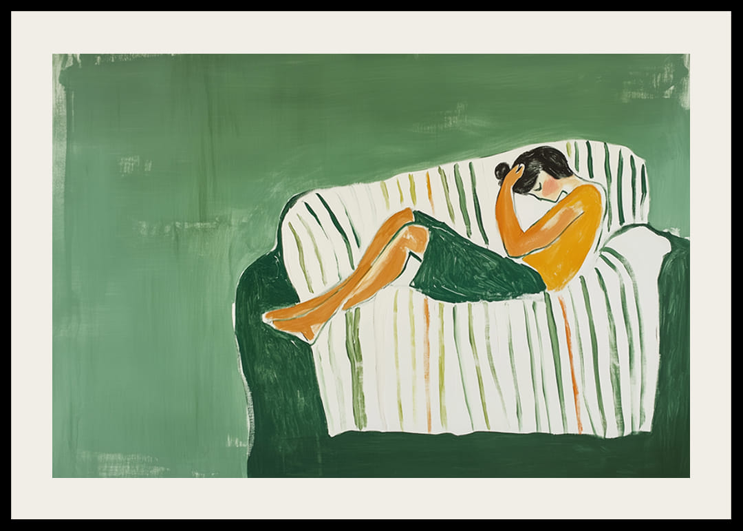 Šiame plakate užfiksuota ramybės ir savistabos akimirka, vaizduojama atsipalaidavusi figūra sodriai žaliame fone. Švelnūs potėpiai ir harmoningos spalvos sukuria ramybės ir ramybės pojūtį.