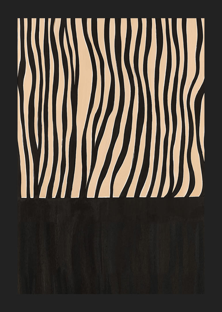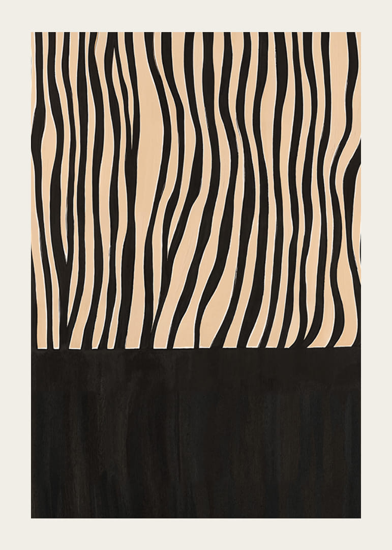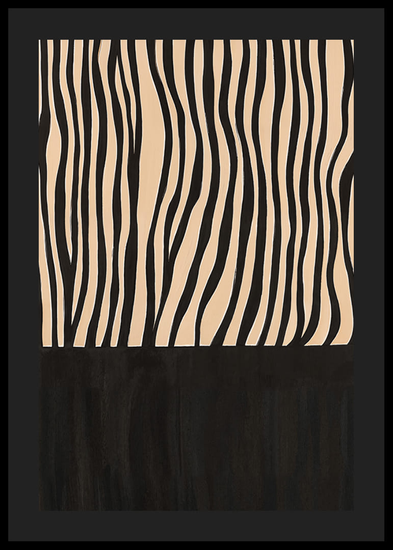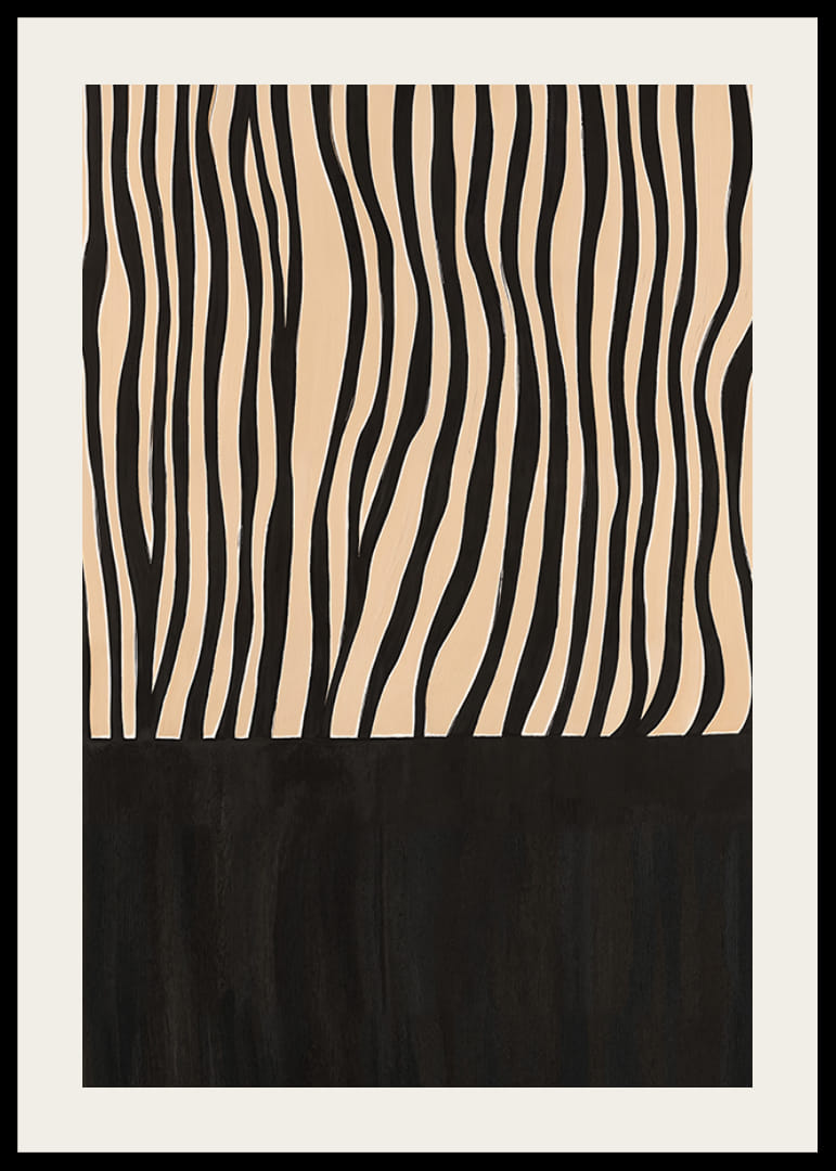 Šis plakatas patraukia dėmesį savo elegantiškomis juodai baltomis juostelėmis, kurios sukuria hipnotizuojantį ritmą. Abstraktus raštas primena savanos žavesį ir bet kurį kambarį paverčia stilinga laukinės elegancijos oaze.