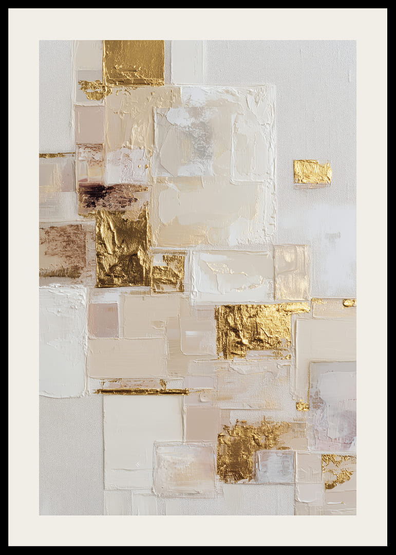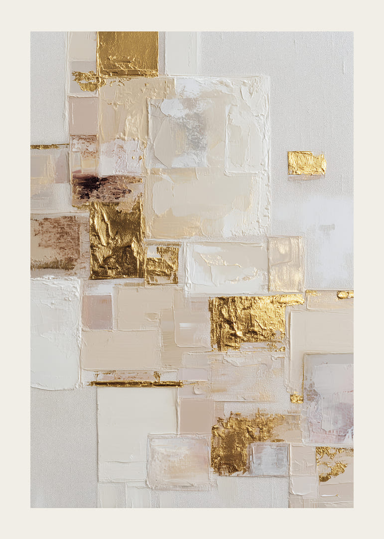 Šis plakatas iš karto patraukia akį savo paauksuotais paviršiais, kurie žėri subtiliuose, abstrakčiuose tonuose. Skirtingos tekstūros ir spalvos sudaro harmoningą ir eterinį raštą. Kiekviena dalis atskleidžia naujus matmenis ir gylius, suteikdama bet kuriam kambariui elegantiško modernumo. Plakatas sienas paverčia meno parodomis ir sukuria ramią, tačiau prabangią atmosferą.