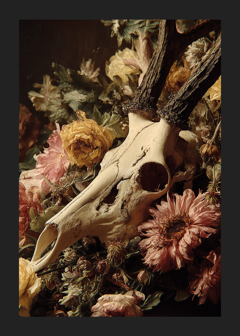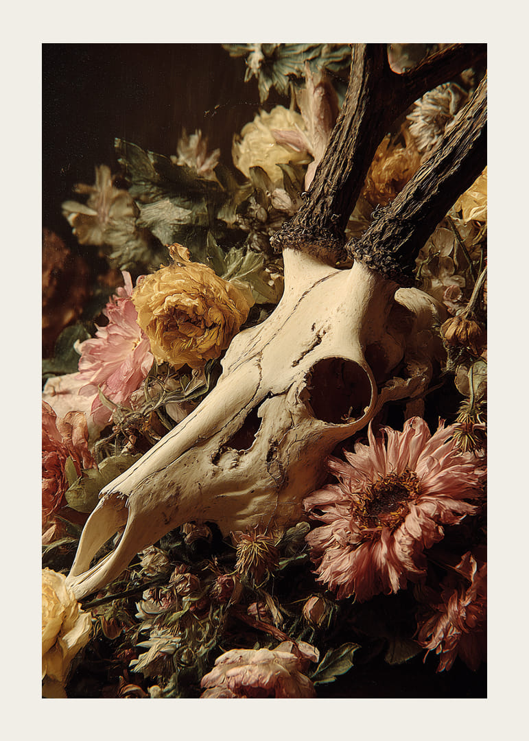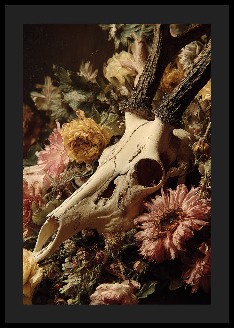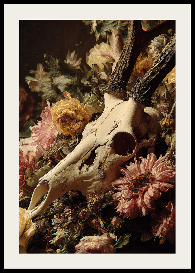 Dramatiška harmonija tarp nudėvėtos kaukolės ir ryškių gėlių, šis plakatas perteikia jausmingą stiprybės ir grožio derinį. Spalvos groja subtilia pastelinių tonų simfonija, o mirties ir gyvenimo kontrastas žadina mintis ir emocijas. Šis plakatas sukuria paslaptingą ir rafinuotą atmosferą jūsų namuose, kur gamtos ciklai primena amžiną gyvenimo ciklą.