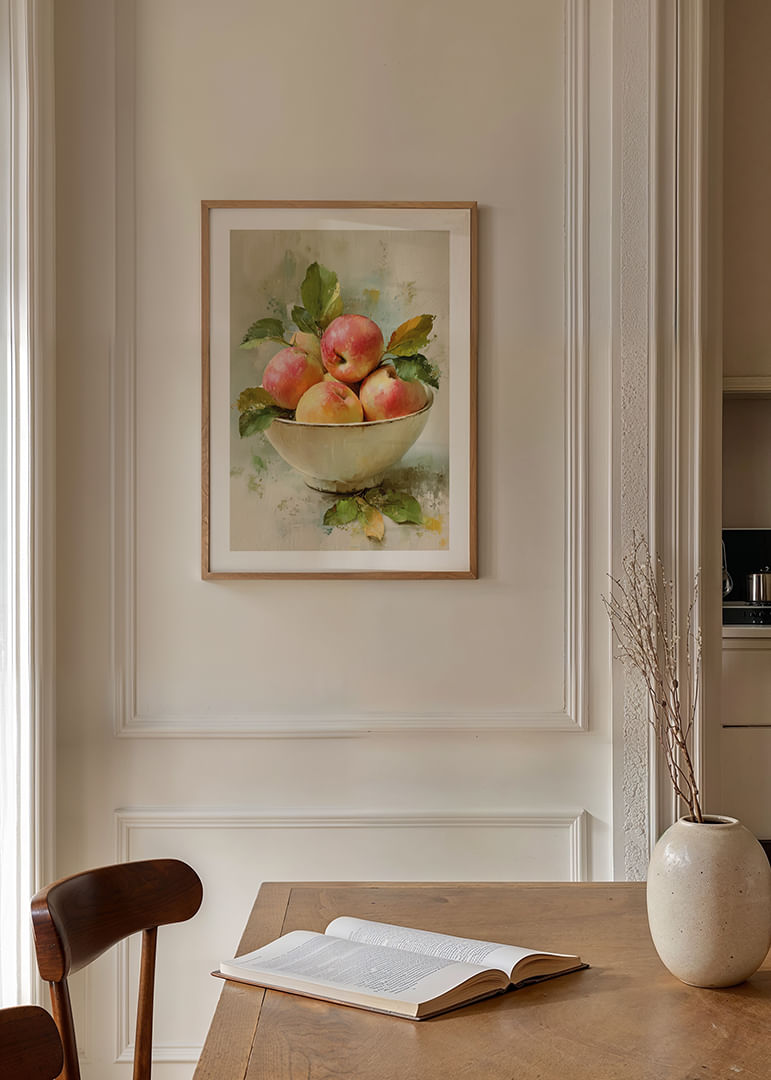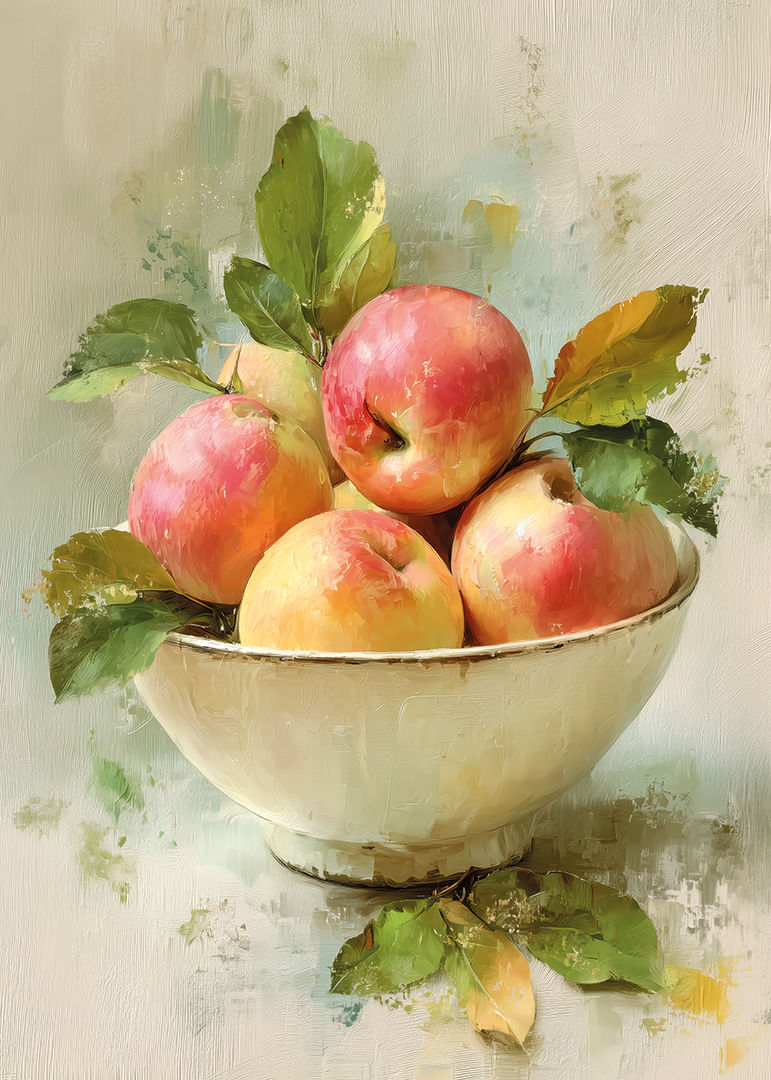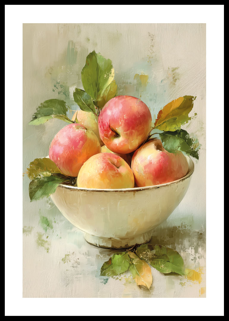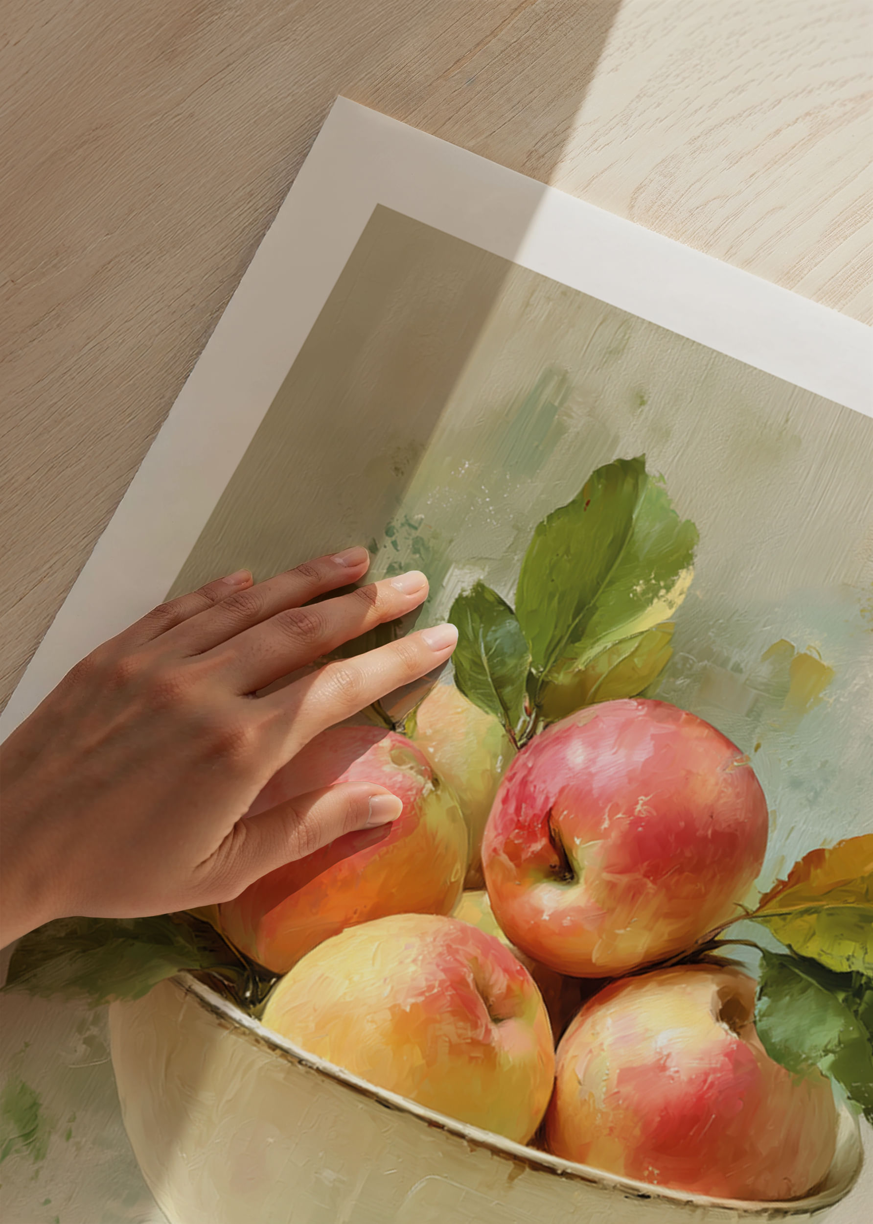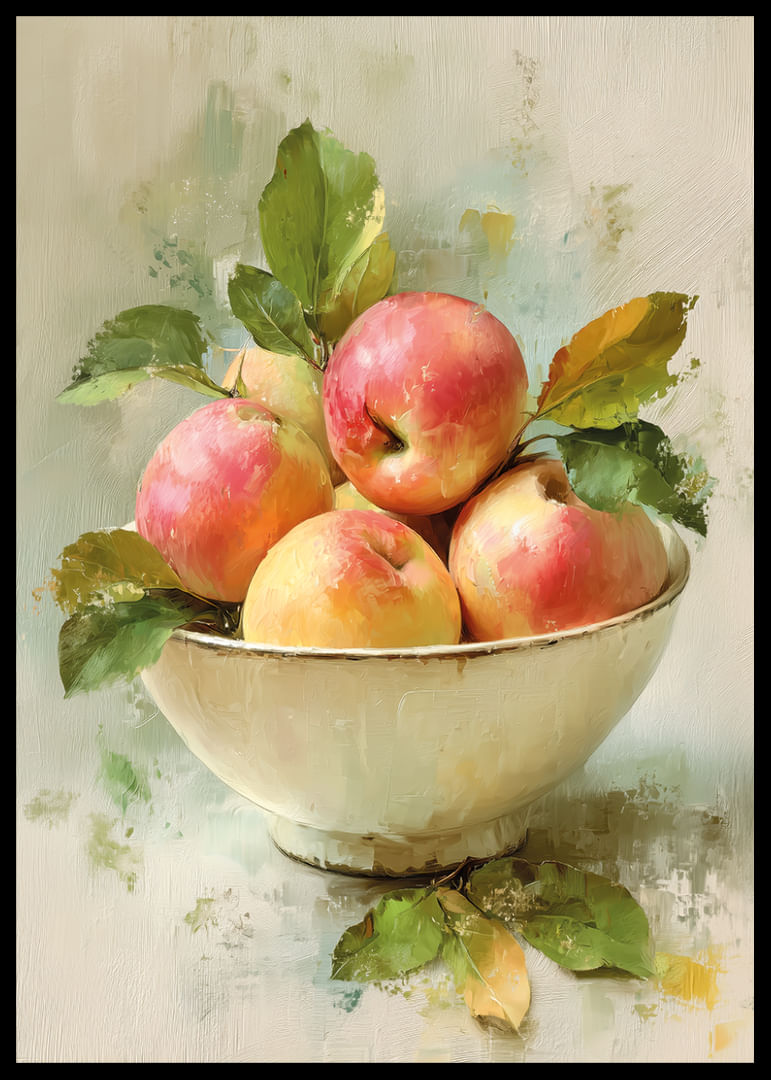 Šis plakatas siūlo nuostabią patirtį su dubeniu, pripildytu šviežių, prinokusių obuolių šiltų raudonos ir geltonos spalvos atspalvių. Vaisius supantys lapai ir švelnus fonas sukuria harmoningą visumą. Meninė raiška perteikia gamtos grožį ir suteikia ramybės bei paprastumo pojūtį. Plakatas sustiprina kambario atmosferą savo natūraliu žavesiu ir nesenstančia elegancija.