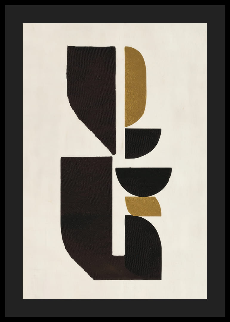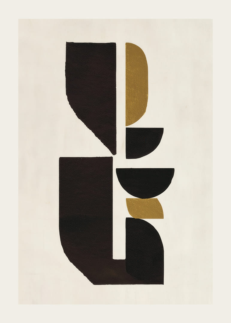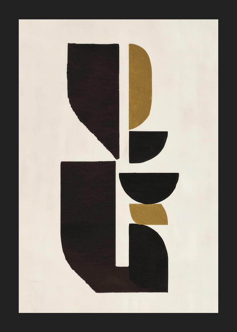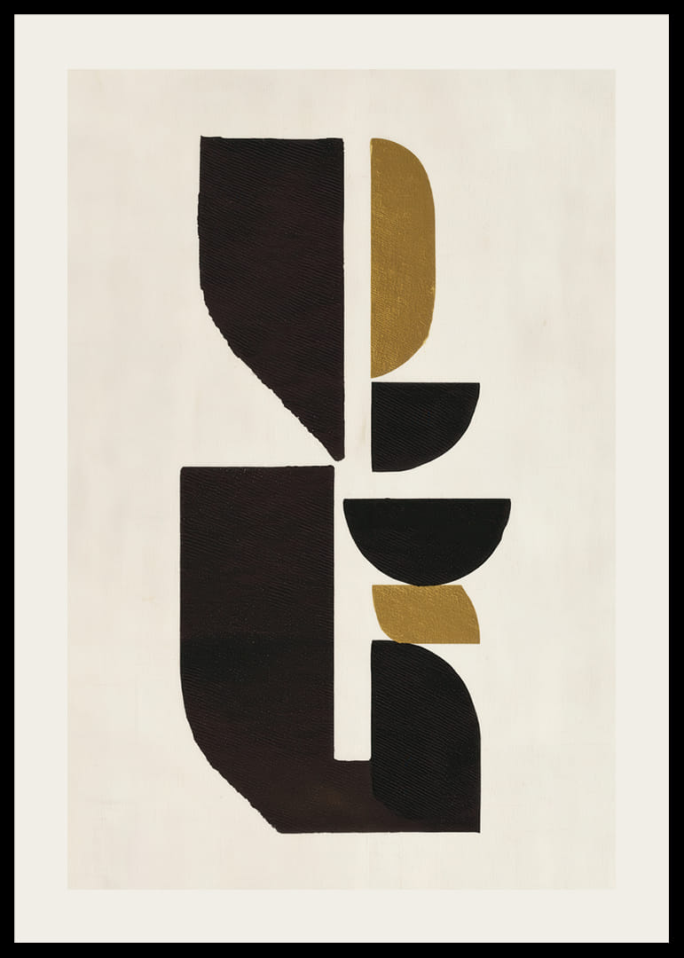 Šis plakatas kviečia jus į abstrakcijos pasaulį, kuriame auksinės ir juodos spalvos formos šoka kartu tobuloje pusiausvyroje. Geometriniai raštai sukelia ramybės ir elegancijos pojūtį, tylią modernaus meno išraišką. Šis plakatas yra subtilus, bet kartu ir galingas akcentas, pakeliantis bet kurio kambario, kuriame jis pakabinamas, nuotaiką ir suteikiantis rafinuoto stiliaus pojūtį.
