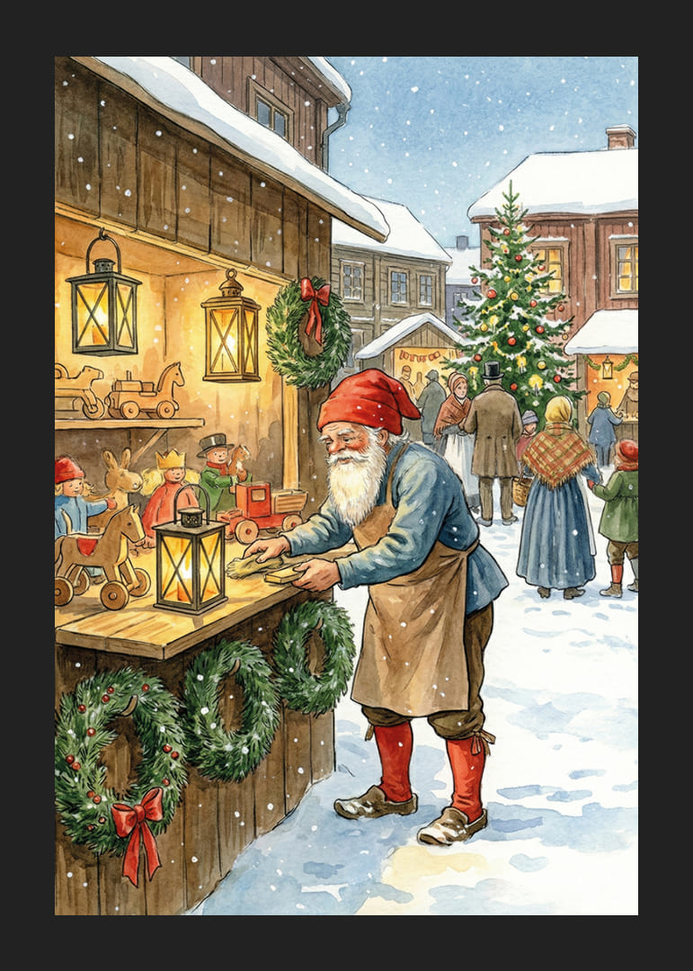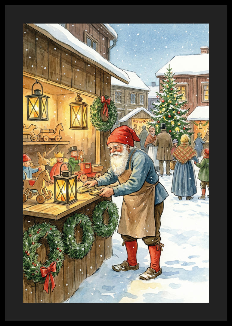 Šis plakatas vaizduoja magišką Kalėdų mugę, kurioje elfas kruopščiai drožia žaislus po snieguotu dangumi. Žibintų ir klasikinių girliandų švytėjimas sukuria šiltą ir jaukią atmosferą, kupiną nostalgiškų jausmų. Šis plakatas suteikia nesenstančio žavesio ir kalėdinės dvasios, kuri papuoš bet kurį kambarį ir primins apie Kalėdų džiaugsmą bei tradicijas.
