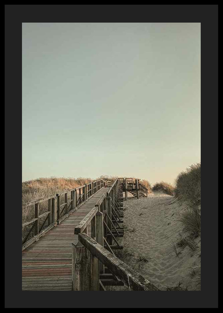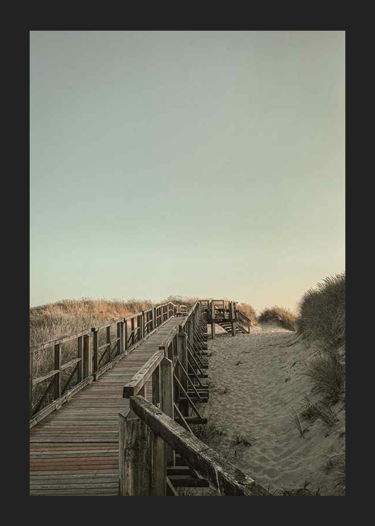 Paplūdimio motyvas, kur medinis molas veda per minkštas smėlio kopas, apsuptas aukštų paplūdimio žolių. Šviesiai pastelinis dangus sukuria atvirą ir tvarkingą paveikslo pojūtį. Šis plakatas suteikia ramią pakrantės aplinką ir puikiai tinka visur – nuo ​​svetainių iki koridorių, kur norima natūralumo.
