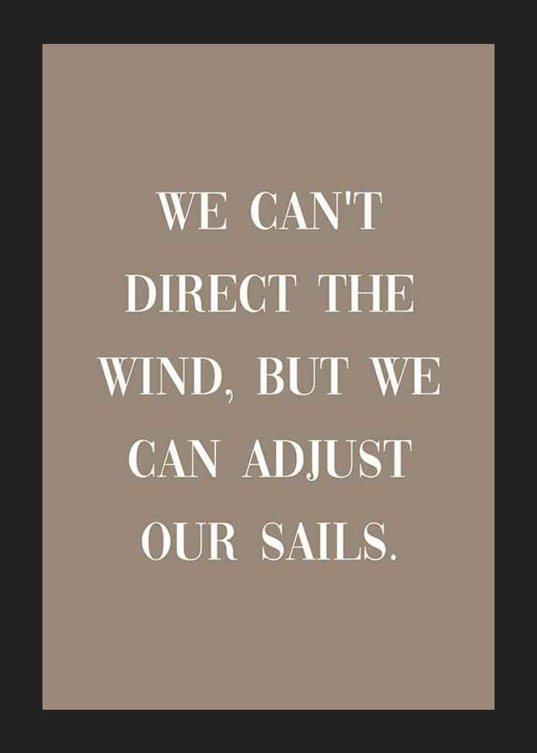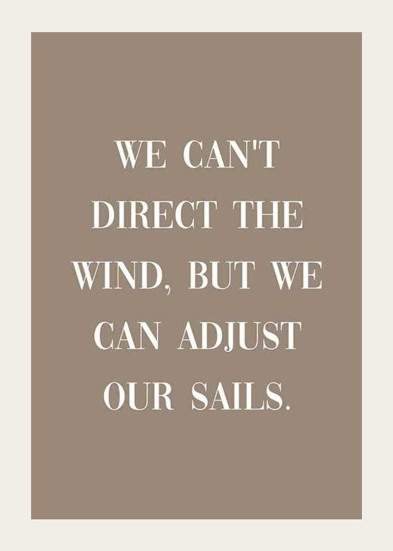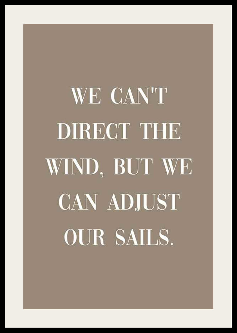 Didelės baltos raidės sudaro citatą „Mes negalime nukreipti vėjo, bet galime reguliuoti savo bures“ rudame, visiškai vientisame fone. Minimalistinis dizainas ir aiški tipografija paverčia šį plakatą ramia ir įkvepiančia detale namams, ypač darbo kambaryje ar svetainėje.