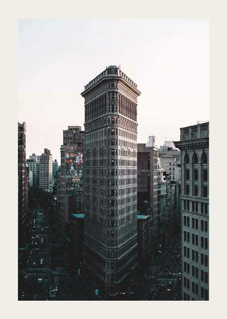 „Flatiron“ pastatas iškilęs dizaino centre, apsuptas aukštų miesto pastatų ir judrių Manhatano gatvių. Šį legendinį 22 aukštų, 87 metrų aukščio dangoraižį pabrėžia prislopinti pilkos ir smėlio spalvos atspalviai, suteikiantys plakatui urbanistinį, istorinį pojūtį moderniuose interjeruose.