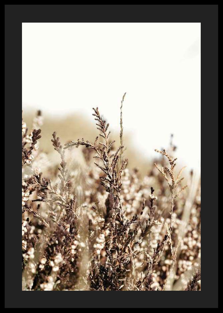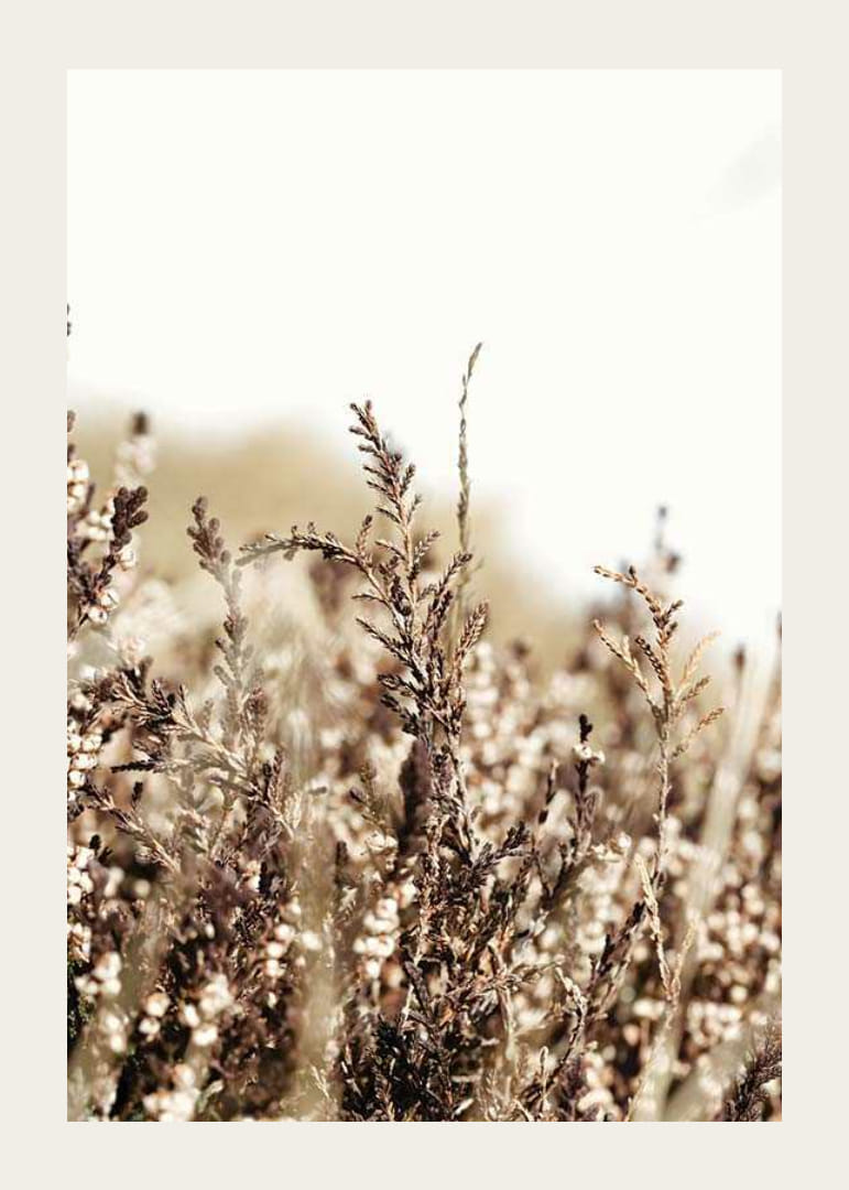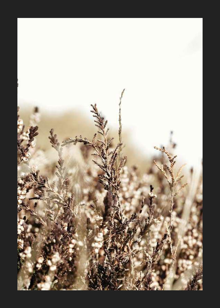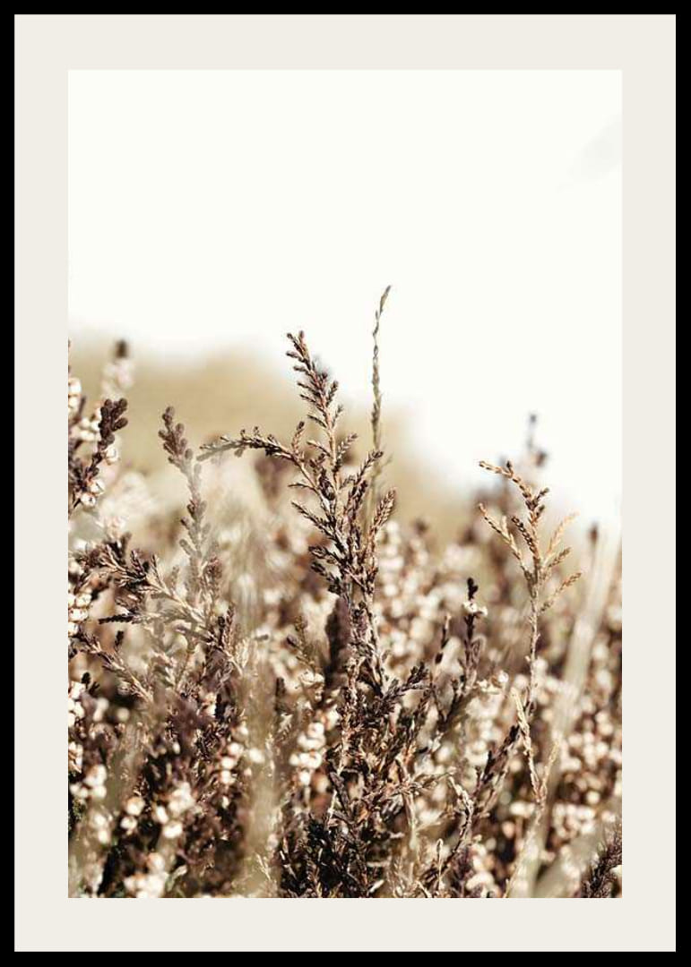 Sausos žolės ir laukinių šiaudų stambus planas šviesiame, beveik baltame fone. Šilti rudi ir smėlio atspalviai suteikia motyvui natūralią ir ramią išraišką. Fotografinis stilius išryškina struktūras ir detales. Tinka tiek svetainėms, tiek miegamiesiems, kur plakatas sukuria žemišką pojūtį.