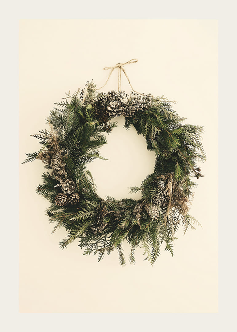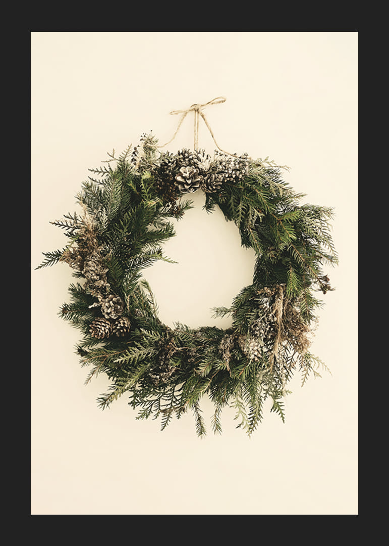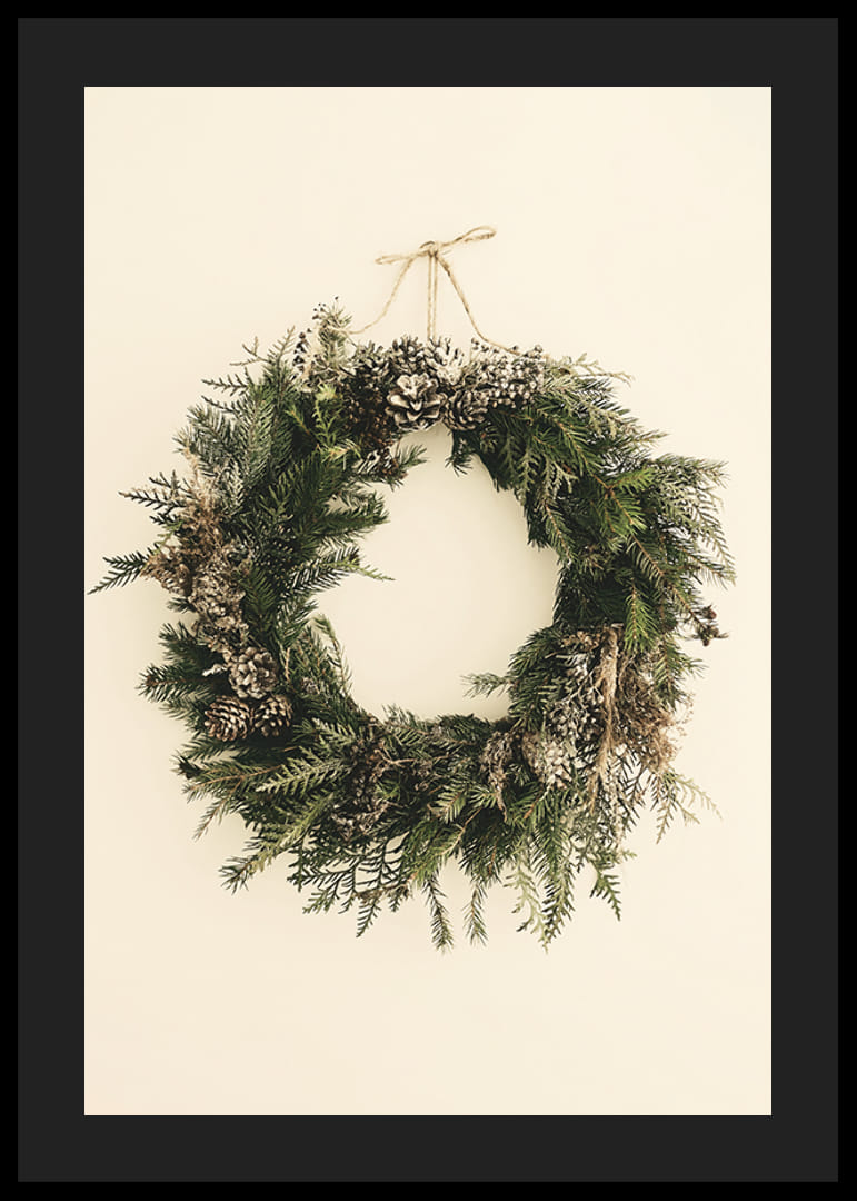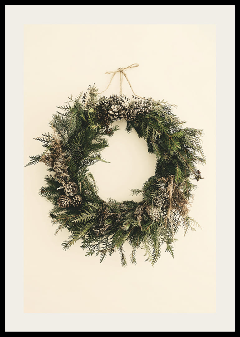 Šilto smėlio spalvos fone kabo visžalių eglių šakų vainikas, papuoštas pušies kankorėžiais ir lengva dirbtinio sniego antklode. Natūralūs žali ir rudi atspalviai sustiprina žiemišką motyvo nuotaiką. Šis plakatas puikiai tinka kambariams, kuriuose ištisus metus norisi subtilios kalėdinės atmosferos.