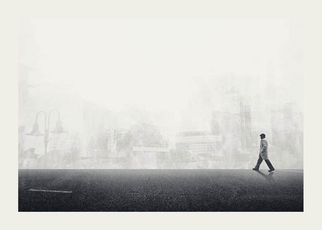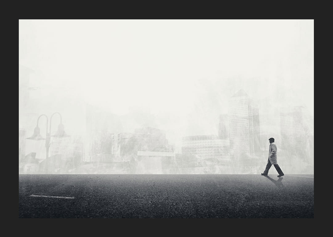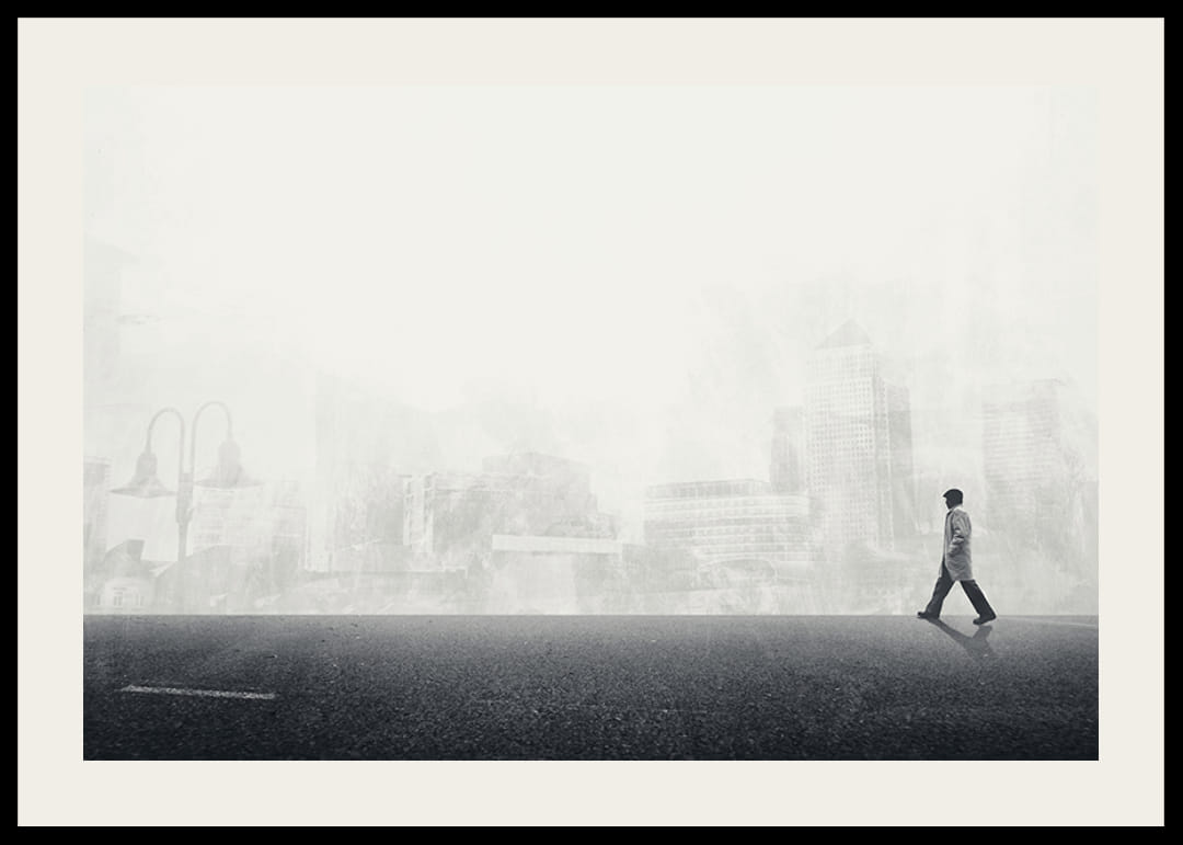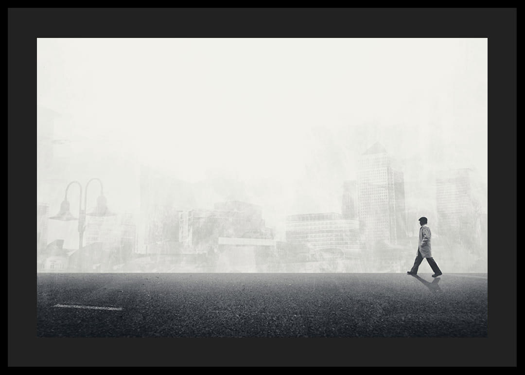 Motyve pavaizduotas vienišas vyras su skrybėle ir paltu, einantis iš kairės į dešinę per tuščią gatvę. Fone matomas išsklaidytas, monochrominis aukštybinių pastatų ir miesto aplinkos siluetas, suteikiantis erdvės ir atspindžio pojūtį. Šis juodai baltas plakatas suteikia namams modernią, konceptualią išraišką.