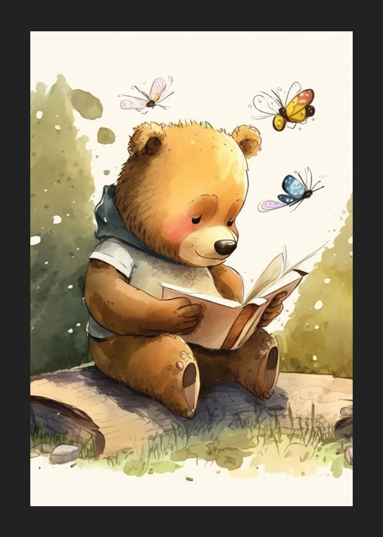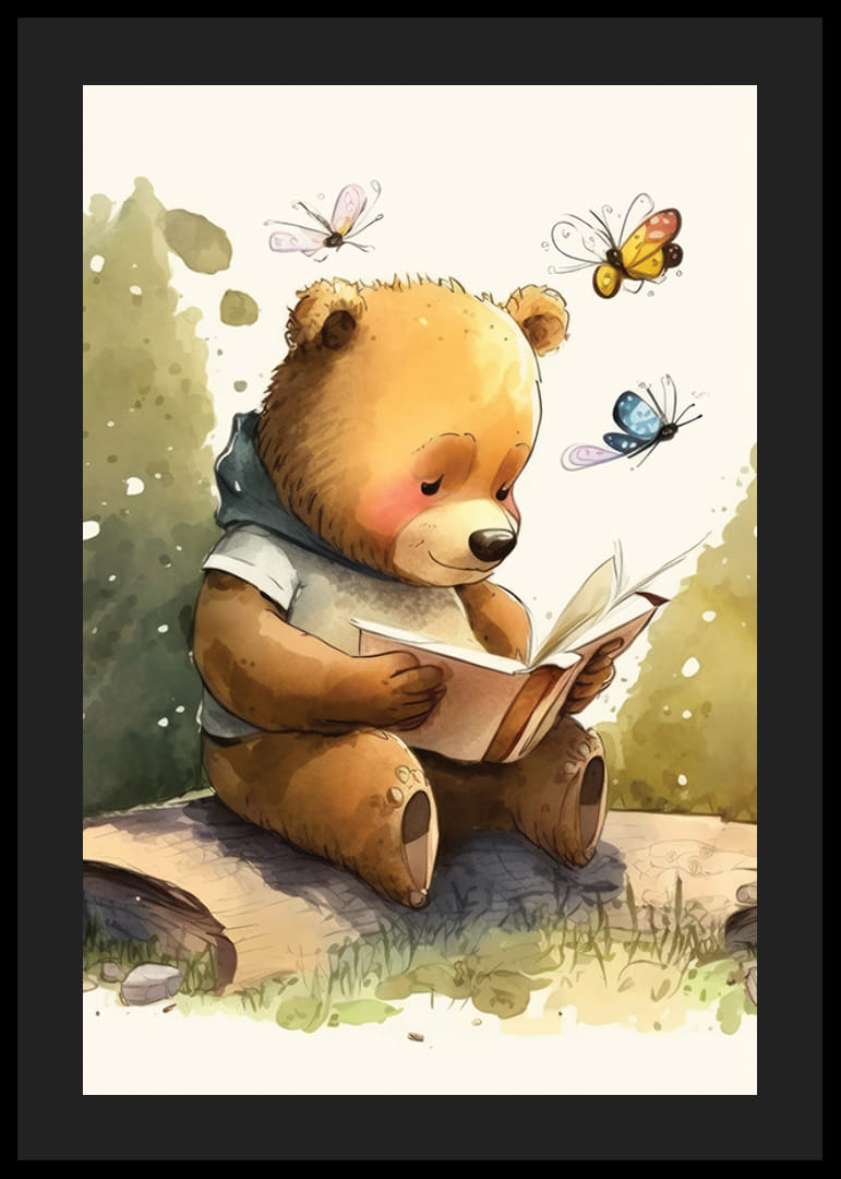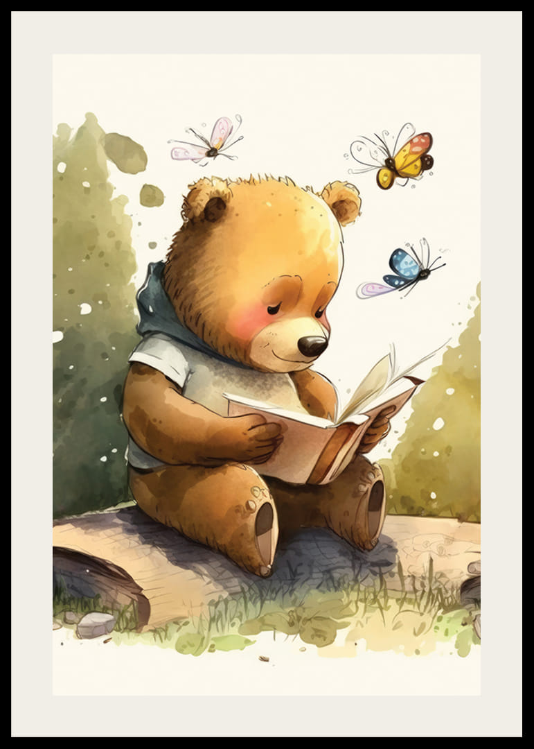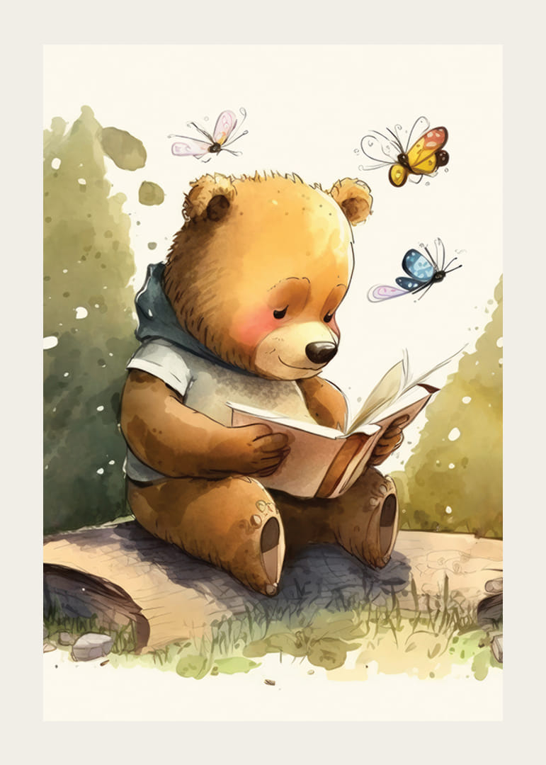 Rudasis lokys tupi ant medžio kamieno su atversta knyga rankose, apsuptas spalvingų drugelių. Švelnūs akvarelės žali, rudi ir smėlio atspalviai iliustracijose sukuria šiltą ir gyvybingą atmosferą. Šis plakatas suteikia vaikų kambariams ar žaidimų aikštelėms vaizduotės pojūtį ir skatina smalsumą bei meilę skaitymui.