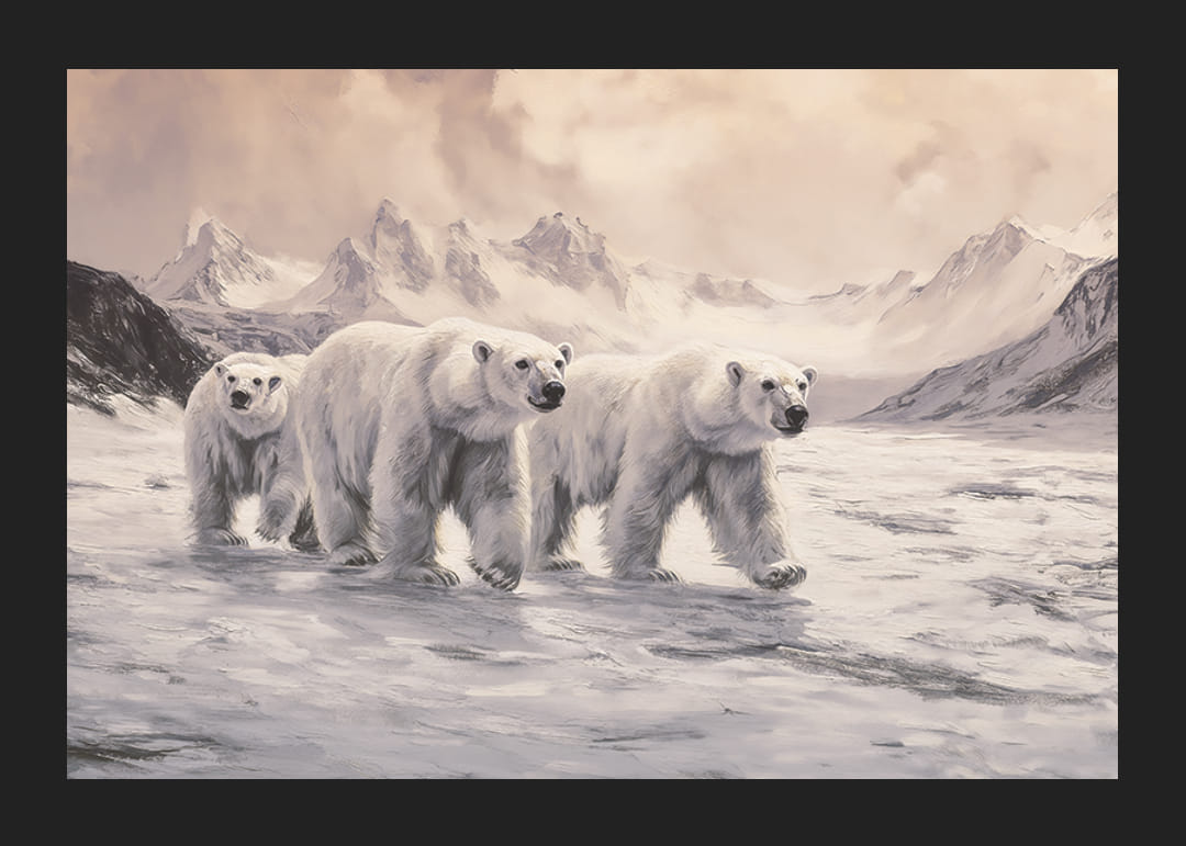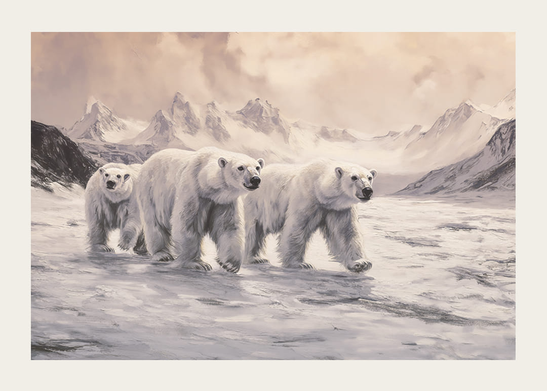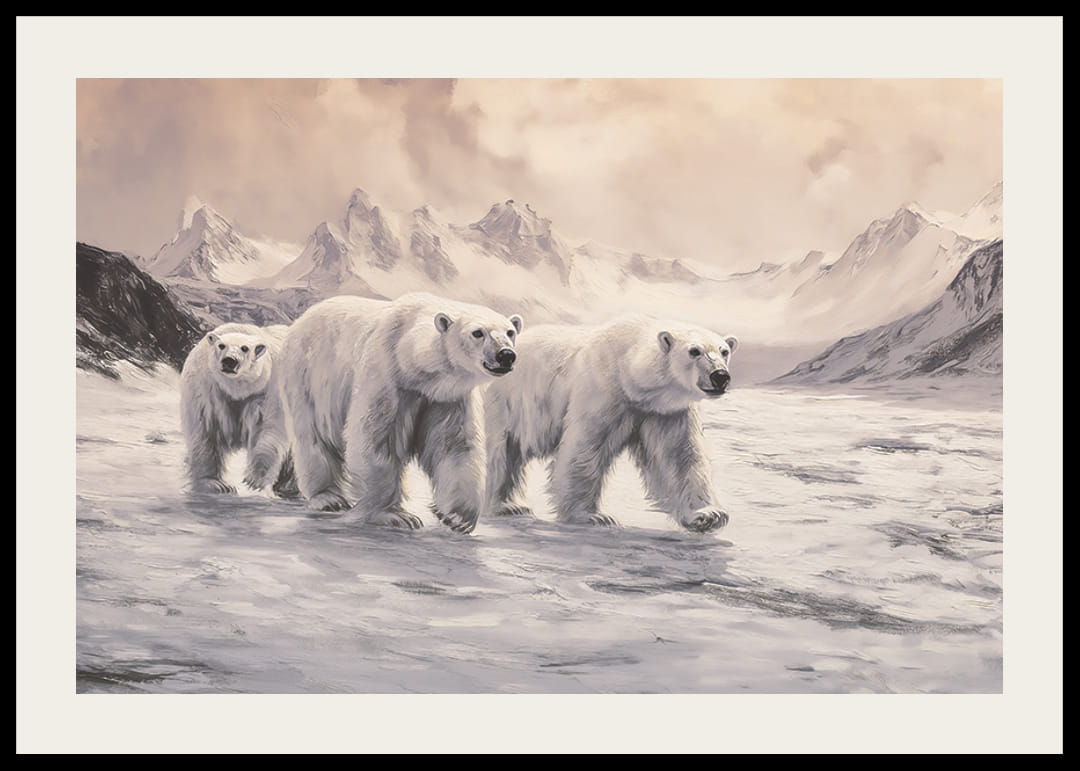 Šiame nuostabiame plakate užfiksuota didinga baltųjų lokių šeima, keliaujanti nevaisingu ir sustingusiu kraštovaizdžiu, apsuptu kalnų ir arktinės ramybės. Vaizdas perteikia tiek jėgą, tiek grožį ir yra duoklė galingam baltųjų lokių buvimui natūralioje aplinkoje. Puikiai tinka jūsų namams suteikti dykumos grožio pojūtį ir neapdorotą Šiaurės šalių gamtos eleganciją – galios ir ramybės įvaizdį.