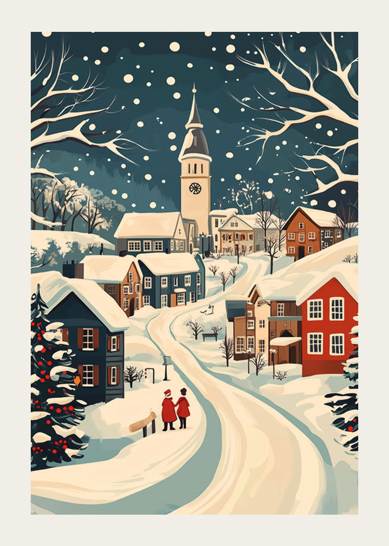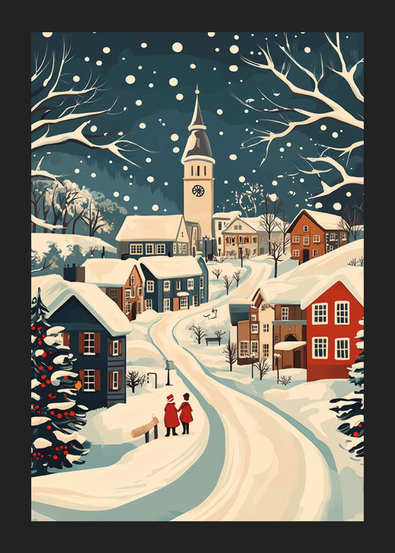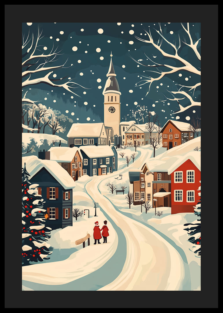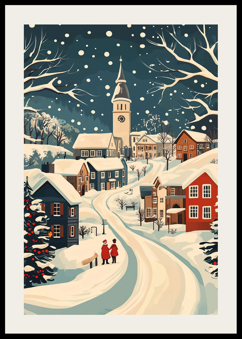 Susigundykite šio plakato žavingu žiemos peizažu su vaizdingu kaimu sniege. Apsnigti stogai ir vingiuotas kelias sukuria ramybės ir ramybės atmosferą. Švelniai krintančios snaigės užburia akį ir pagilina žiemos magijos atmosferą.