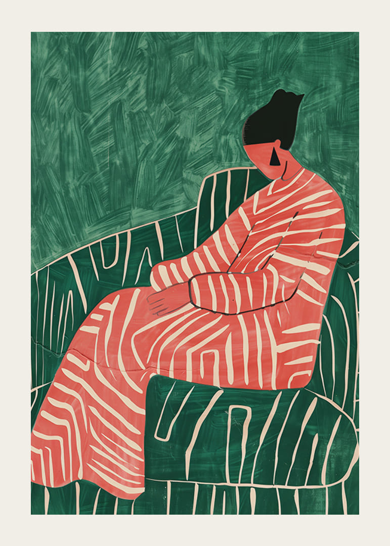 Šiame elegantiškame ir abstraktiame plakate pavaizduota atsipalaidavusi figūra raudona, raštuota suknele, kuri dera su žaliai dryžuotu foteliu. Darnios linijos ir kontrastingos spalvos sukuria ramų ir šiuolaikišką pojūtį.