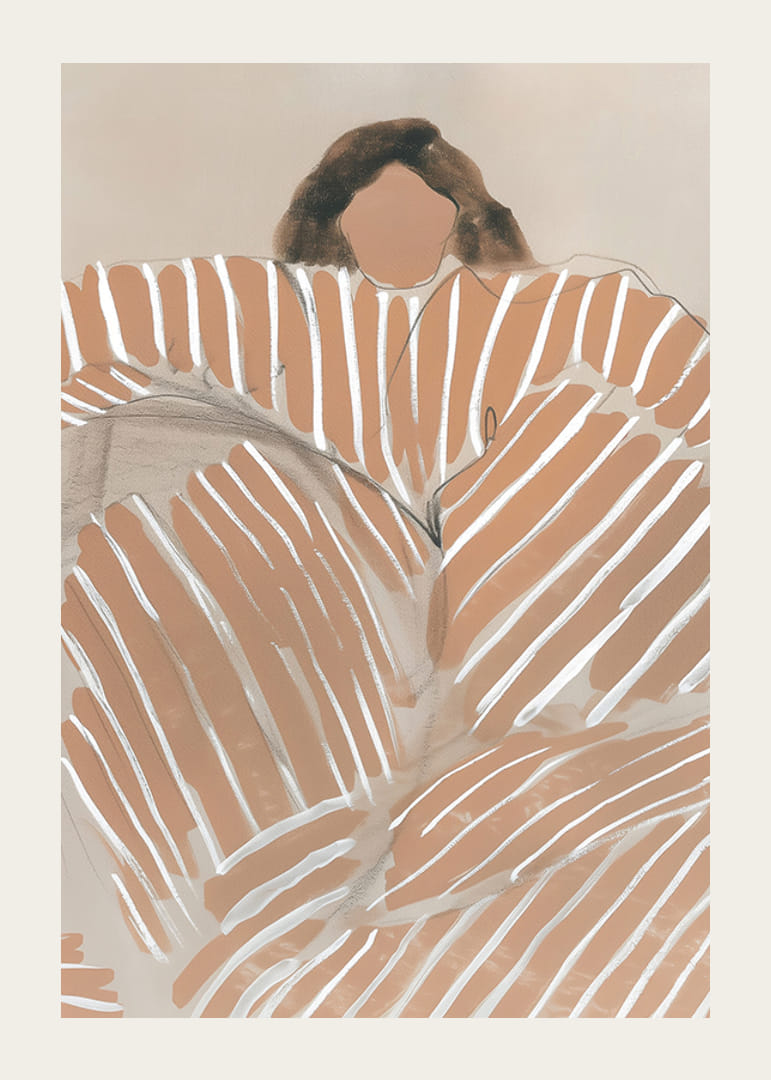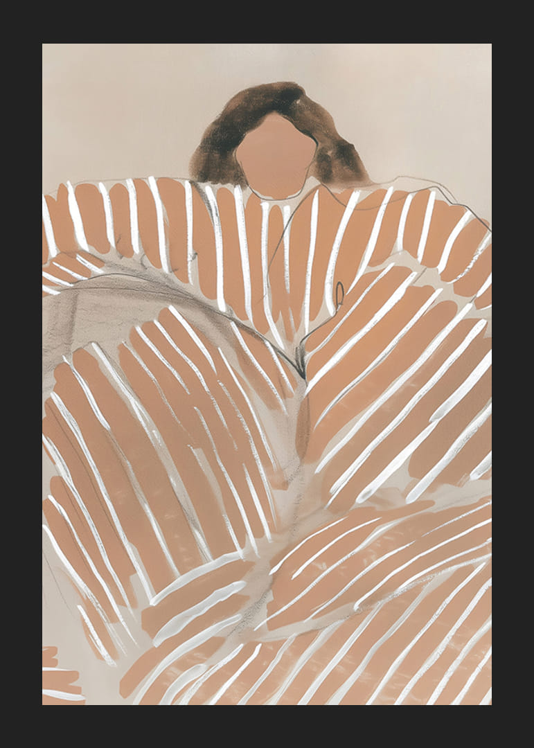 Atraskite plakatą, kuris švelniais, žemiškais tonais ir grafinėmis linijomis patraukia akį ir sielą. Atsipalaidavusios figūros įvaizdis sukuria laisvės ir harmonijos jausmą bet kuriame kambaryje. Kontrastingos juostelės prislopintame fone suteikia šiuolaikiškumo.