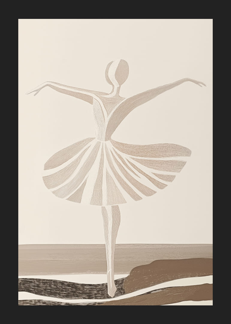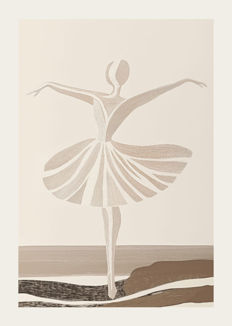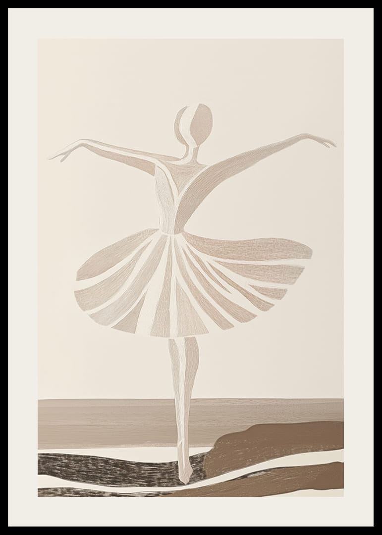 Patirkite grakštumą ir eleganciją šiame abstrakčiame baleto šokėjos plakate. Meistriškai išpuoselėta linija švelniais, neutraliais tonais fiksuoja šokio judesį ir laisvę, įkvepiančiais ramybės ir grožio pojūtį. Puikiai tinka norint į namus ar biurą suteikti meninio rafinuotumo.