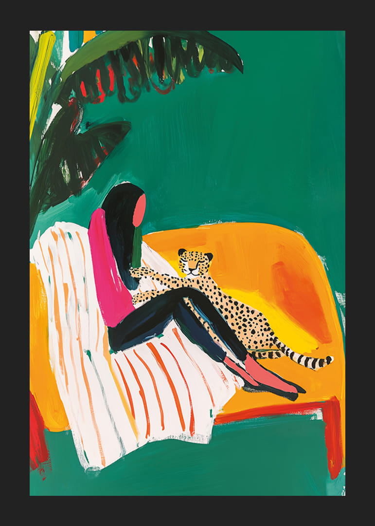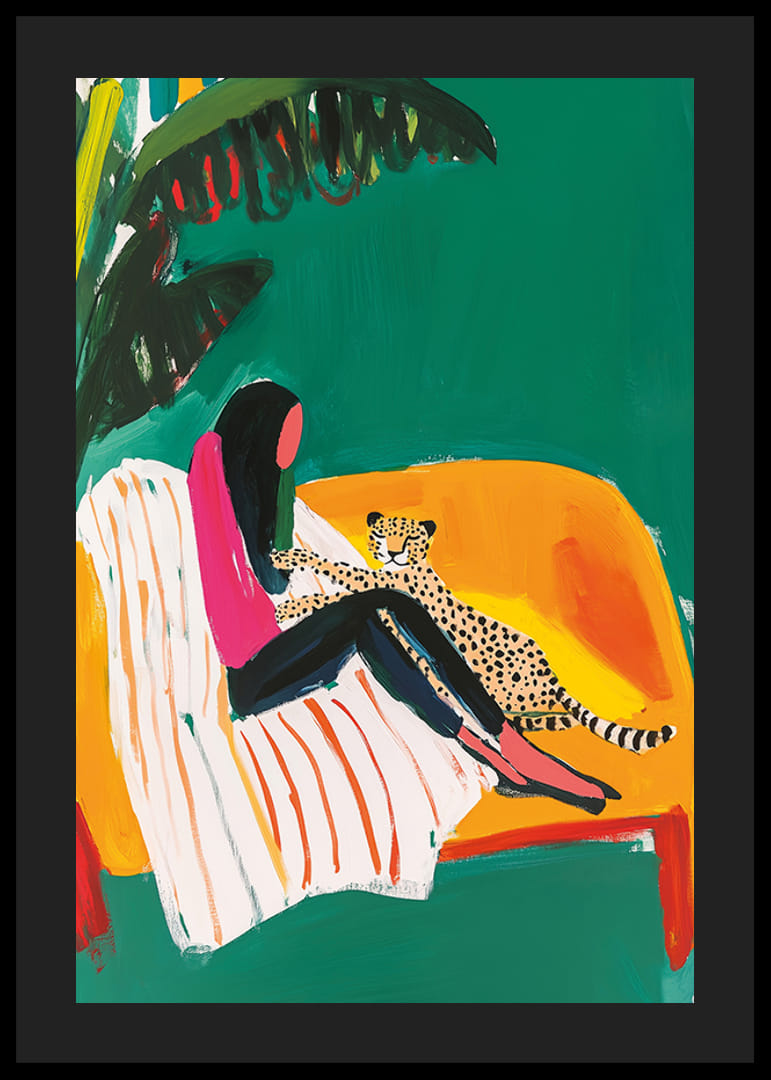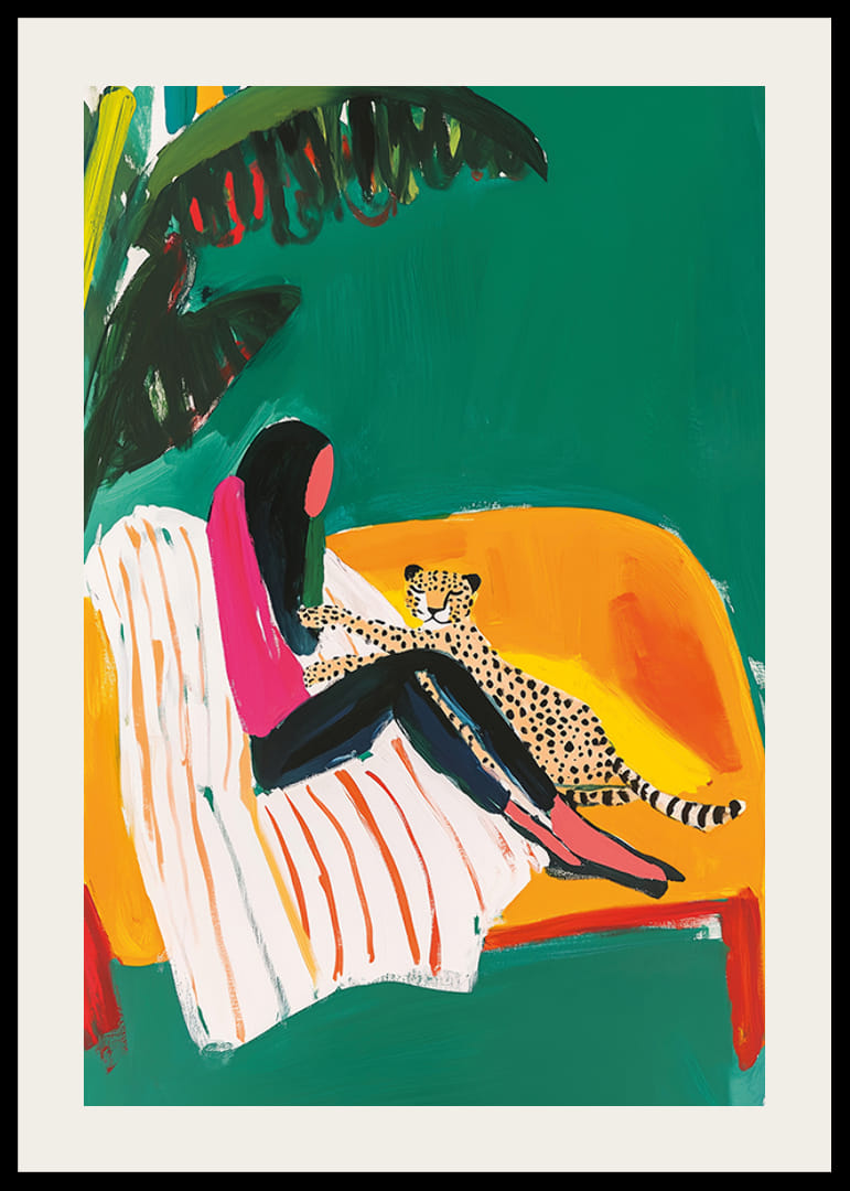 Pripildykite savo namus egzotiškos elegancijos su šiuo ryškiu plakatu! Moteris rožinės spalvos viršutinėje dalyje nerūpestingai sėdi ant sofos su gepardu šalia jos, spalvingame kambaryje su žaluma kaip fonas.