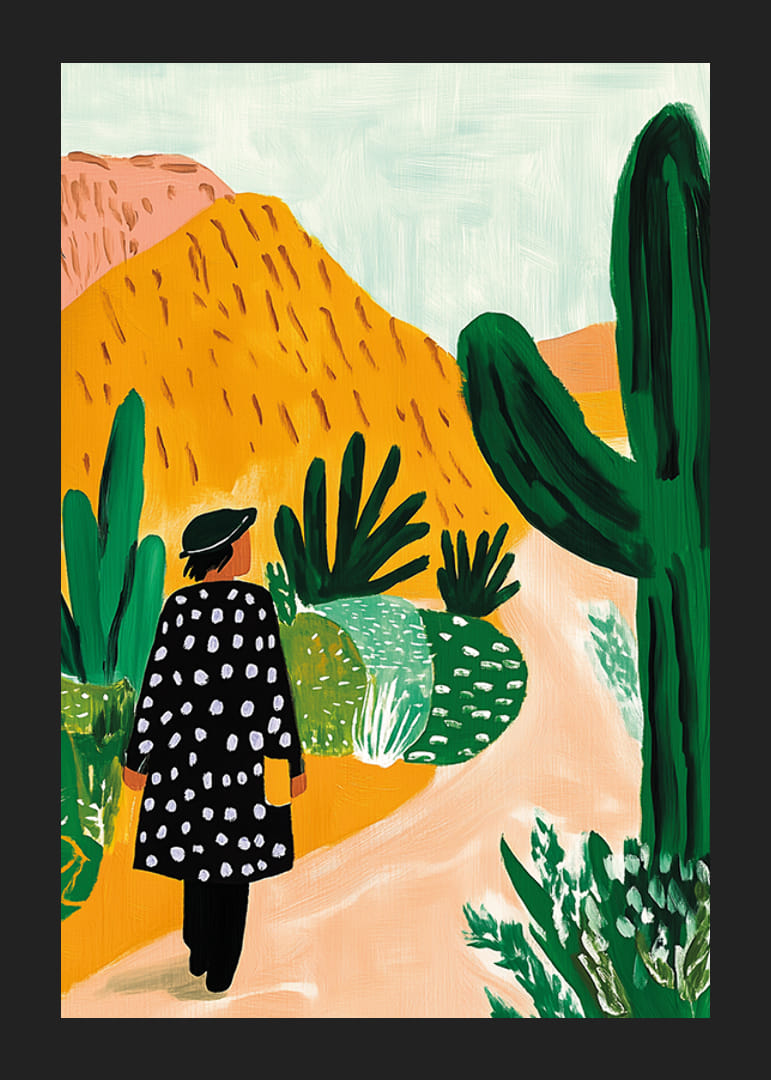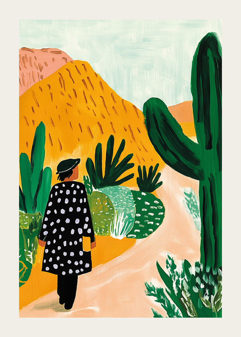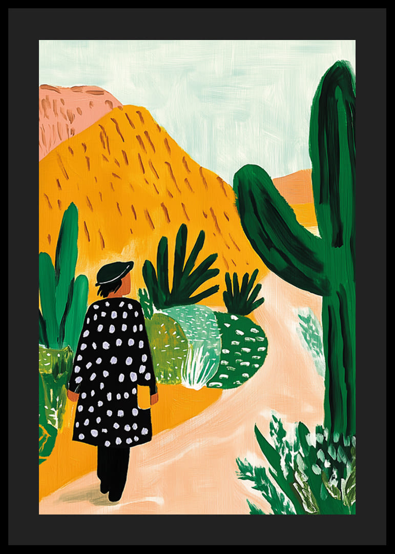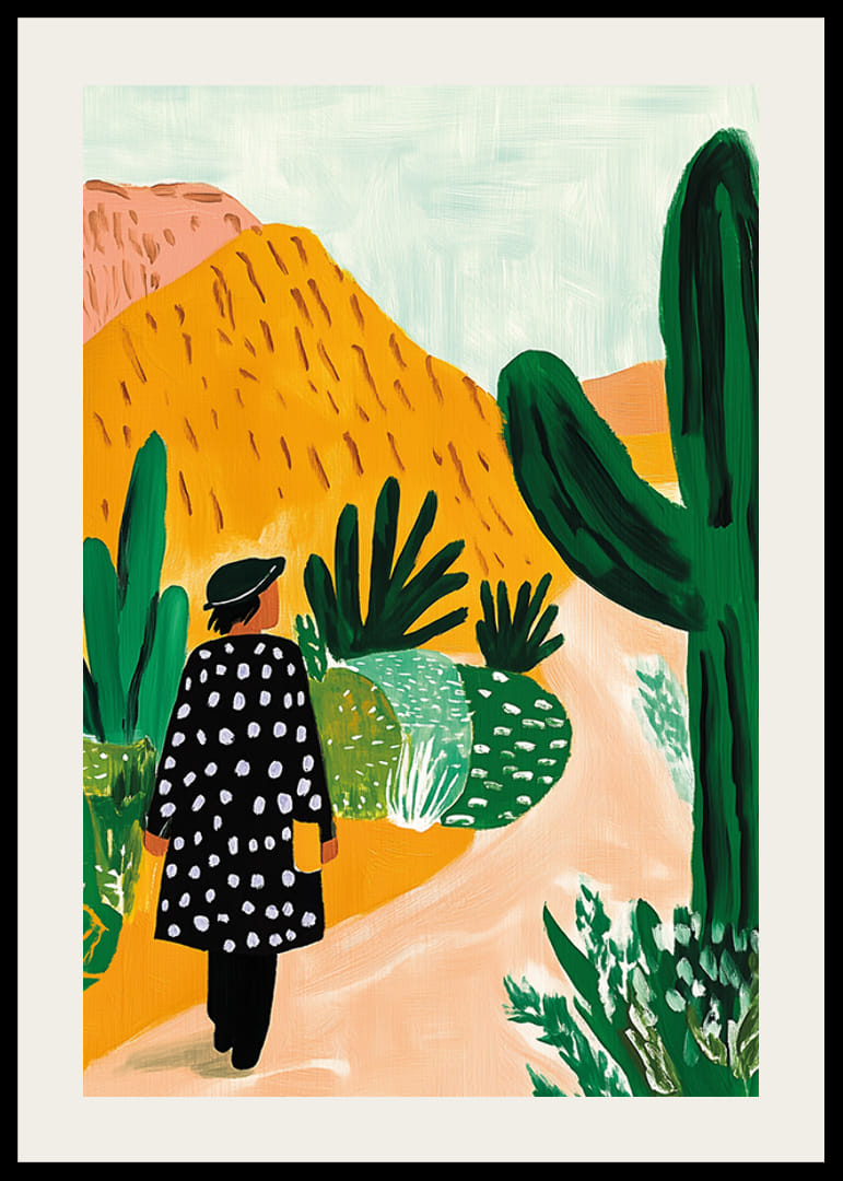 Atraskite stebuklingą žmogaus ir gamtos susitikimą su šiuo ryškiu plakatu! Spalvingas žygis po dykumos kaktusus ir auksinio smėlio peizažus perteikia nuotykių pojūtį. Taškuotas paltas šiltų fono tonų fone sukuria dinamišką kontrastą, kuris patraukia akį.