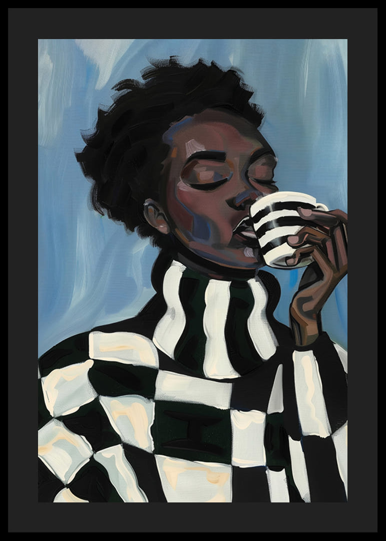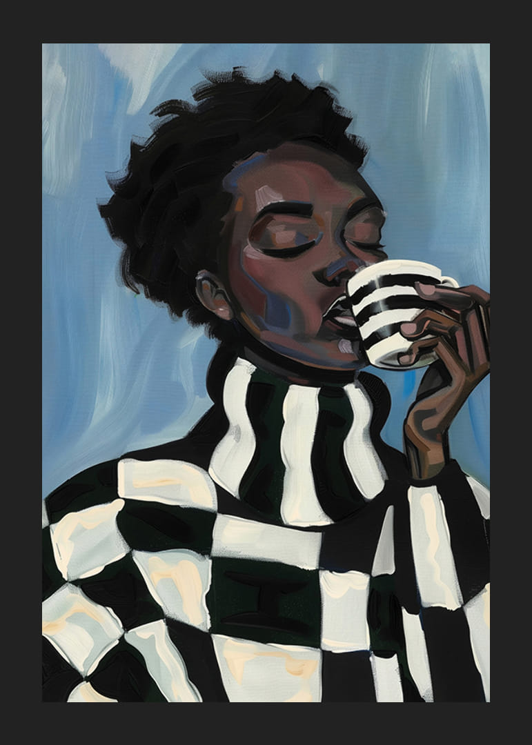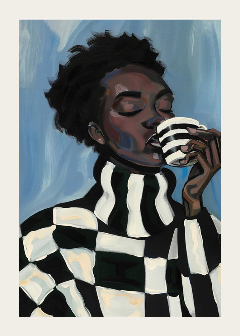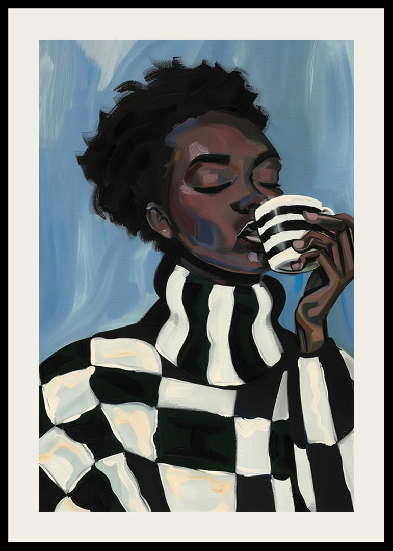 Šis žavus plakatas perkelia jus į elegancijos ir stiliaus pasaulį. Moteris, pasipuošusi drąsiu, dryžuotu drabužiu, mėgaujasi akimirka kavos pertraukėle. Ryškios linijos ir svajingas švelnių mėlynų tonų fonas sukuria ramybės ir rafinuotumo atmosferą.